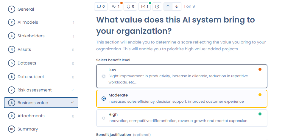 The next section of the form will ask you to define the added value of the AI system. Here, you have to choose between 3 levels of value, ranging from low to high. You can justify this value by describing what the system brings to your organization, such as performance gains or risk minimization.