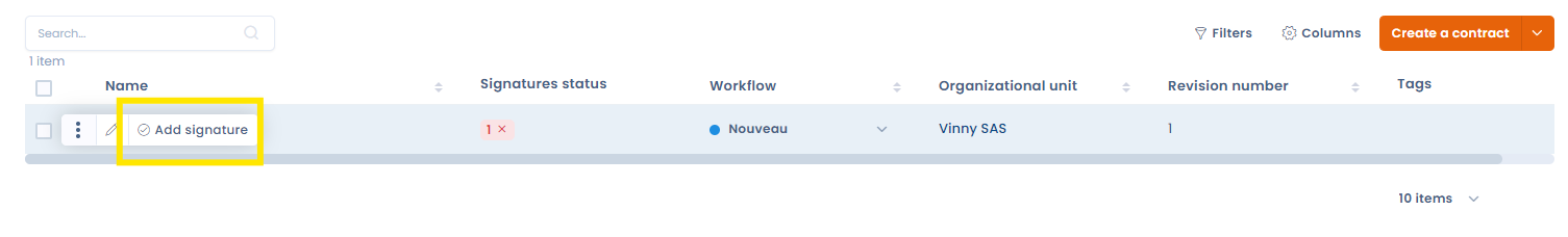 In the main actions area of your contract (see ), you will find a button related to signatures. Depending on the number of signatories listed and the number of signatures received, this button will change status: