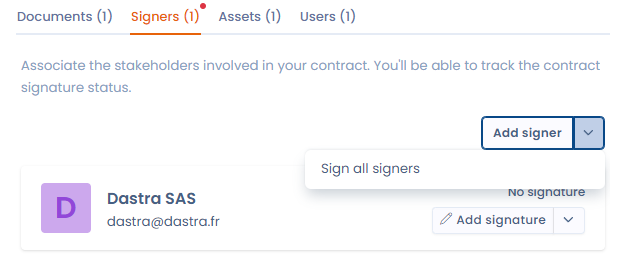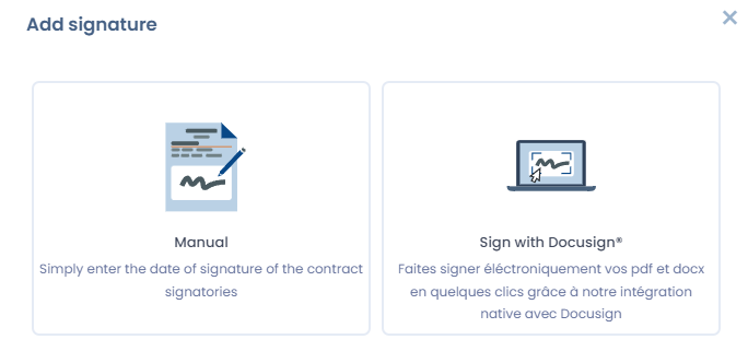 You have the option to declare signatures manually or [integrate with Docusign](https://doc.dastra.eu/en/features/contrats/integration-avec-docusign) to handle the entire electronic signature process electronically. This integration streamlines the signing workflow and ensures compliance with electronic signature requirements.