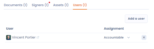 You can associate users from your workspace with your contract to define roles such as **Accountable**, **Responsible**, or Informed.