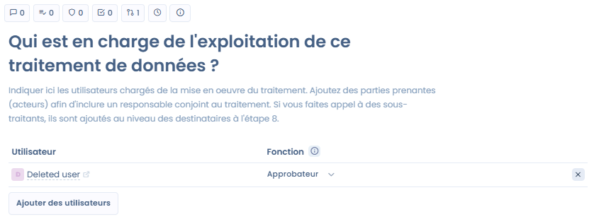 <figure><img src="https://1301193153-files.gitbook.io/~/files/v0/b/gitbook-x-prod.appspot.com/o/spaces%2F-LvBxs22wUMicv9uWp6C-2584506019%2Fuploads%2FEbghWwhJoPz2dgmlA9LV%2FCapture%20d&#x27;%C3%A9cran%202025-05-15%20102626.png?alt=media&#x26;token=42e8243a-96d4-4017-a777-63a84a3f276a" alt=""><figcaption><p>Utilisateur supprimé définit en tant que partie prenante du traitement</p></figcaption></figure>