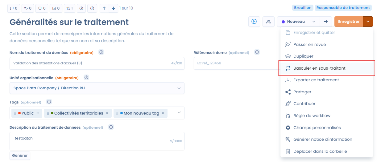 Vous pouvez changer de type de traitement en cliquant sur "Basculer en sous-traitant" ou "Basculer en responsable de traitement" :&#x20;