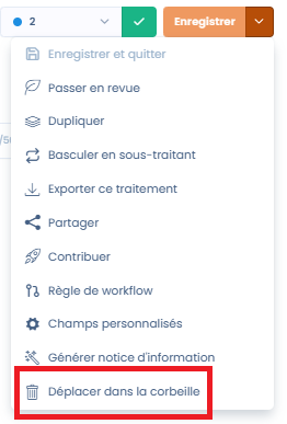 Pour supprimer un traitement, il y a nécessairement un passage par la corbeille via le bouton "Déplacer dans la corbeille" et ensuite en affichant la corbeille depuis les filtres, il est possible de supprimer définitivement le traitement. Cela constitue un garde fou contre les suppressions hâtives.