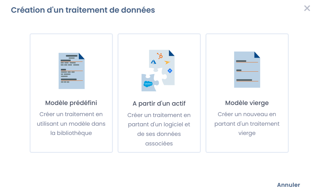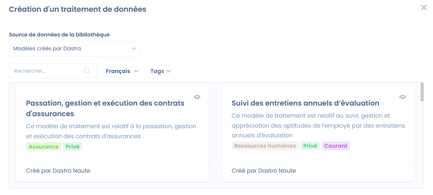 Dastra vous permet de créer votre registre des activités de traitement à partir de modèles conçus par nos experts.&#x20;