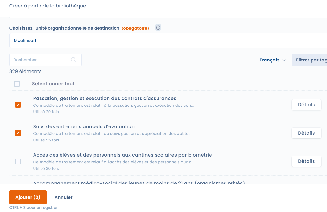 Sélectionnez un ou plusieurs modèles, choisissez une unité organisationnelle et cliquez sur "ajouter"