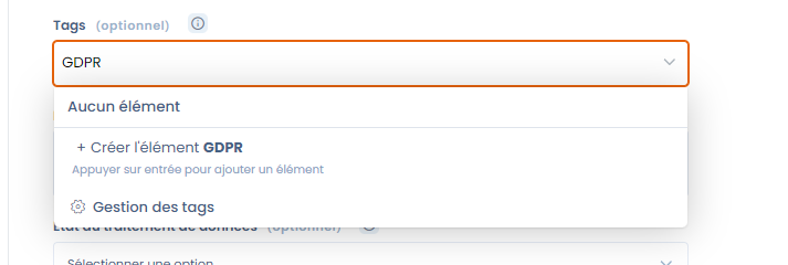 Dans le formulaire de saisie des tags, commencez à taper le nom de n'importe quel tag, il y a deux possibilités, soit le tag existe déjà, dans ce cas vous pouvez le sélectionner. Si il n'existe pas, vous pouvez appuyer sur **la touche entrée de votre clavier**, ce qui va créer le nouveau tag automatiquement pour l'ajouter à la liste de sélection