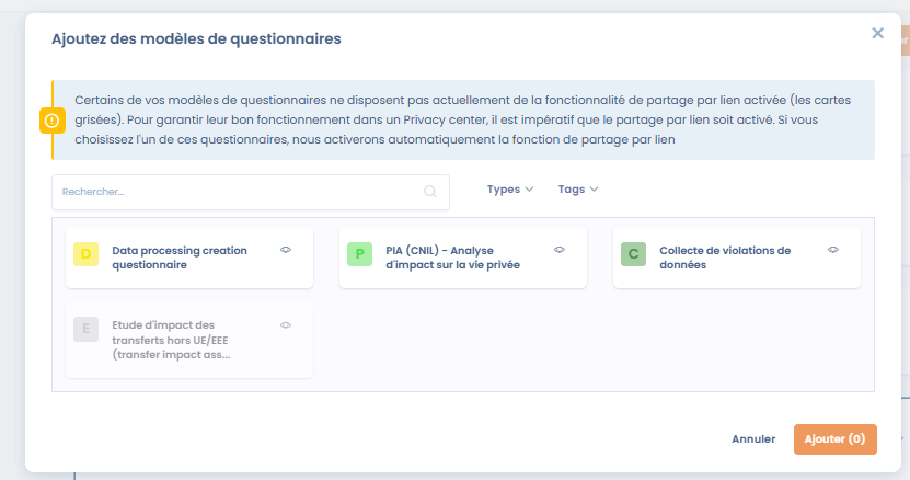 **Note importante** : Pour fonctionner correctement dans un Privacy hub, l'option de partage par lien d'un questionnaire doit être activée. Si vous souhaitez ajouter un questionnaire dont cette option n'est pas activée, celle-ci sera automatiquement activée lors de l'ajout du questionnaire. De plus, l'option de partage par lien ne pourra pas être désactivée tant que le questionnaire sera présent dans votre Privacy hub.