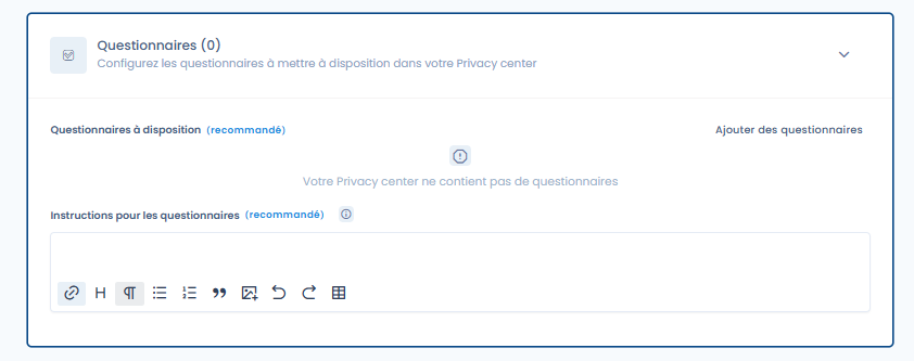 Ce champ de texte enrichi (HTML) vous permet de personnaliser un message avec des options de mise en forme, et d'y intégrer des images ou des vidéos. Ce message sera affiché sur la page public 'Questionnaires' de votre Privacy hub, au dessus de la liste des questionnaires installés dans votre portail.