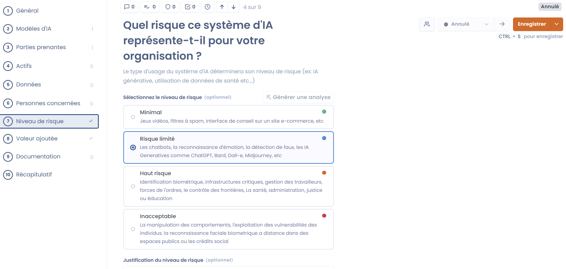 Dastra vous propose de procéder à une **analyse de risque** de vos systèmes d'IA. Dans cette partie du formulaire, vous pouvez assigner un des 4 niveaux de risque à chaque système. **Ces niveaux de risque ont été définis par l'IA Act** et sont classés du risque minimal au risque inacceptable. Nous vous recommandons d'ajouter une description afin de justifier le risque du système.