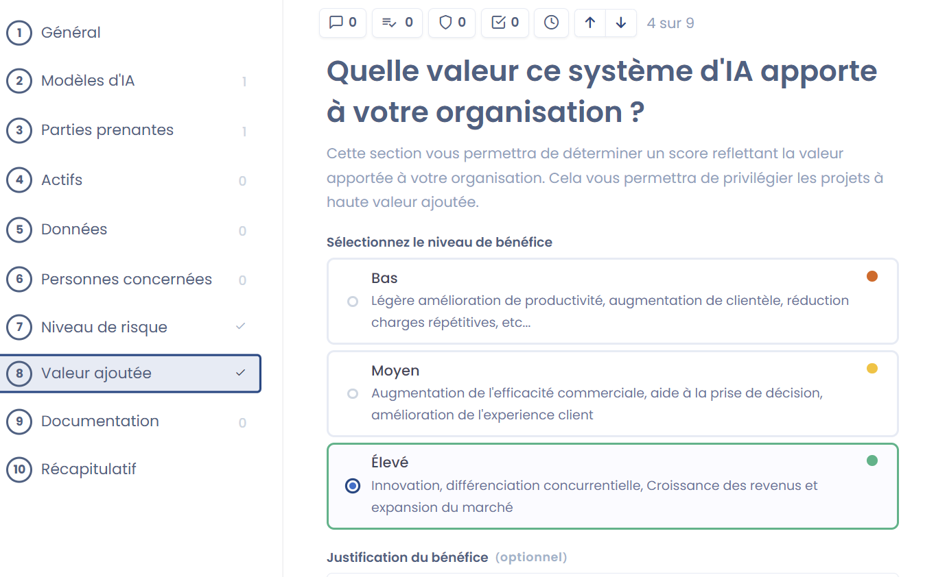 Renseigner à la fois le **niveau de risque** et la **valeur ajoutée** vous permettra de déterminer rapidement si un système d’IA constitue plutôt :