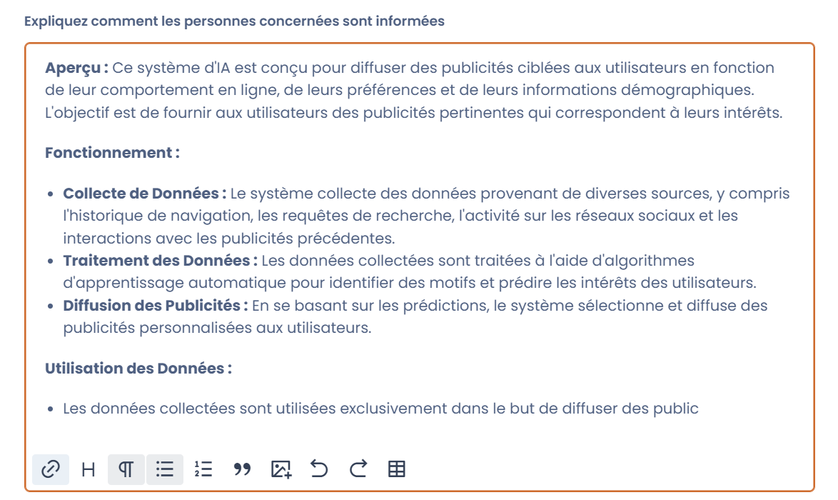 <figure><img src="https://1301193153-files.gitbook.io/~/files/v0/b/gitbook-x-prod.appspot.com/o/spaces%2F-LvBxs22wUMicv9uWp6C-2584506019%2Fuploads%2FMxCrcRgcBxhQVzaodYTv%2FCapture%20d&#x27;%C3%A9cran%202024-06-14%20143244.png?alt=media&#x26;token=efaf978d-4498-4d78-8e79-5405a775dd19" alt=""><figcaption><p>Notice de transparence d'un système d'IA</p></figcaption></figure>