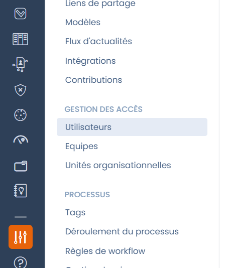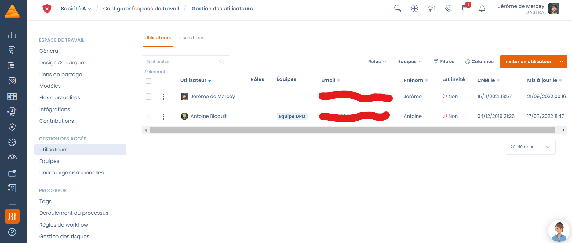 Je kunt gebruikers uitnodigen voor je werkruimte door te klikken op de knop "instellingen" linksonder in het scherm, vervolgens op "toegangsbeheer / gebruikers" en ten slotte op "een gebruiker uitnodigen":