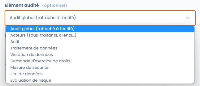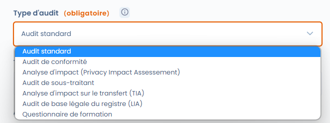 PIA sjablonen zijn opgenomen in de geautomatiseerde audit sjablonen en zijn vrij toegankelijk vanuit de Dastra bibliotheek. Om een PIA sjabloon aan te maken of te wijzigen, klik op "Geautomatiseerde audit", selecteer dan "PIA (CNIL) - privacy effectbeoordeling" voordat je op "Opslaan" klikt.