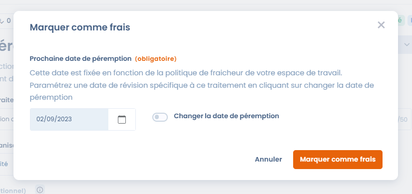 Door de Verwerking als vers te markeren, start je een frisheidscyclus vanaf de datum van vandaag tot de volgende vervaldatum. De vervaldatum wordt standaard berekend volgens het frisheidsbeleid van je werkruimte (frisheidsinterval dat wordt toegepast wanneer de optie Verwerking vers is geactiveerd). Je kunt besluiten om deze standaarddatum te negeren en een specifieke vervaldatum toe te passen op deze Verwerking door de optie "Vervaldatum wijzigen" aan te vinken en een nieuwe datum te selecteren (de vervaldatum moet minstens D+1 zijn).