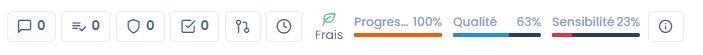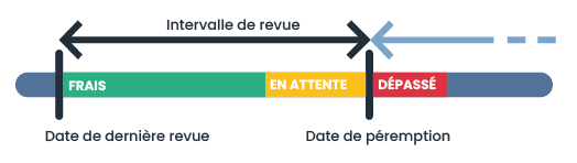 Deze indicator bestaat uit een label met de waarden "Vers", "Relatief vers" en "Verlopen", een kleur (respectievelijk richting, geel, rood), een voortgangsbalk die afneemt naarmate de vervaldatum nadert, een knop om de Verwerking als vers te markeren en het aantal resterende dagen of te laat ten opzichte van de vervaldatum.