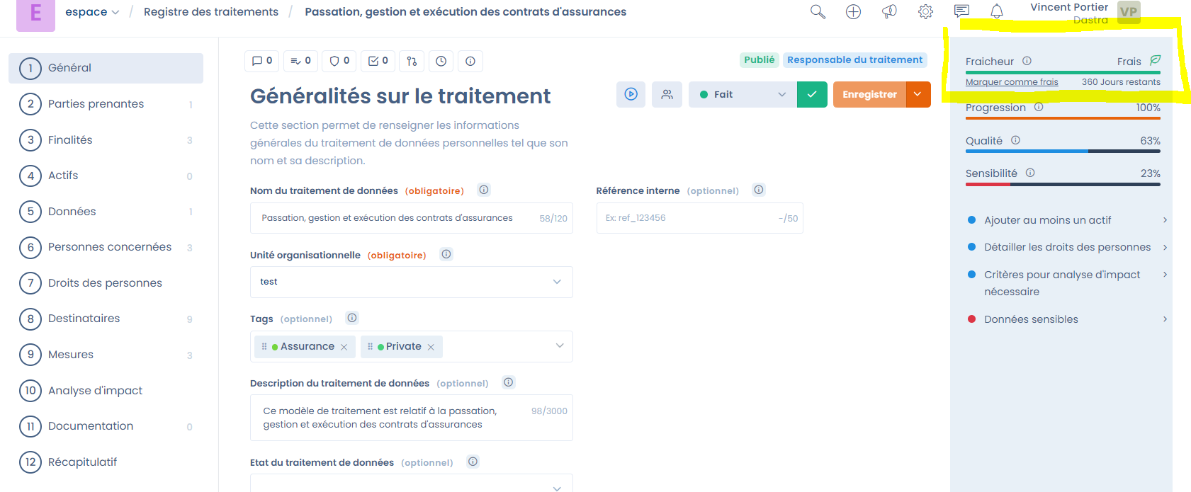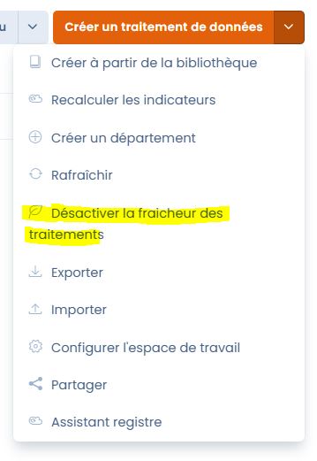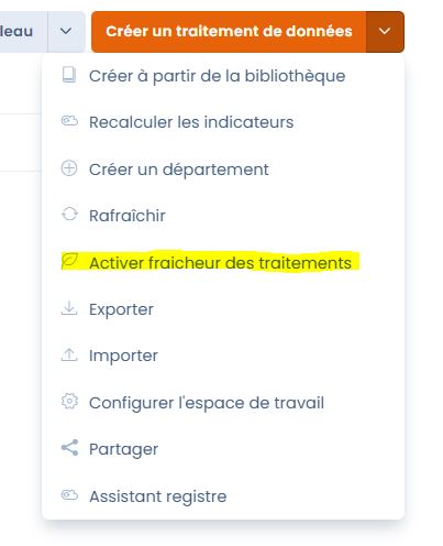 Om de optie te activeren, gaat u naar uw verwerkingsregister, klikt u op de actiekiezer voor de knop "Gegevensverwerking aanmaken" en vervolgens op "Verwerkingsfrisheid activeren"