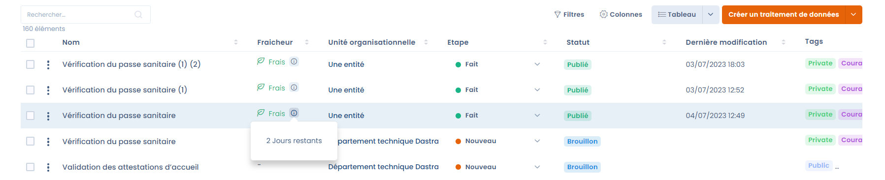 Als u de kolom frisheid weergeeft in de lijstweergave van uw behandelingsregister, kunt u de indicator vinden voor elke Verwerking die voldoet aan de weergavevoorwaarden (gepubliceerde Verwerking met ten minste één datum waarop deze als vers is geïdentificeerd).
